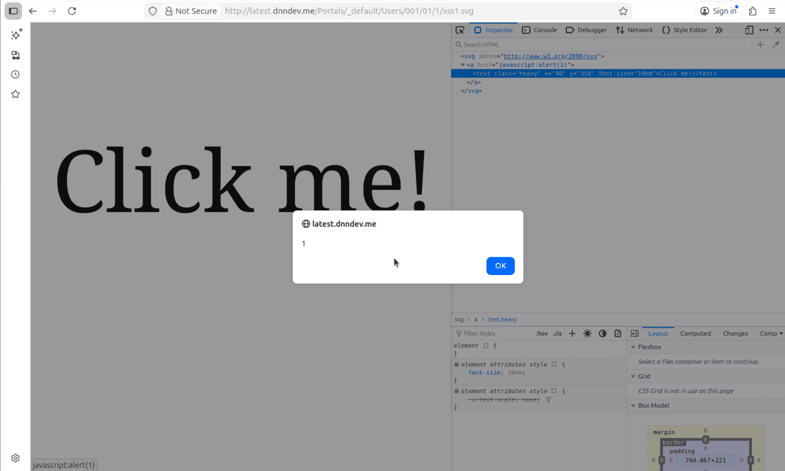 Now, as you can see from the HTTP response, we can find the uploaded file at the following URL: http://latest.dnndev.me/Portals/_default/Users/001/01/1/xss1.svg