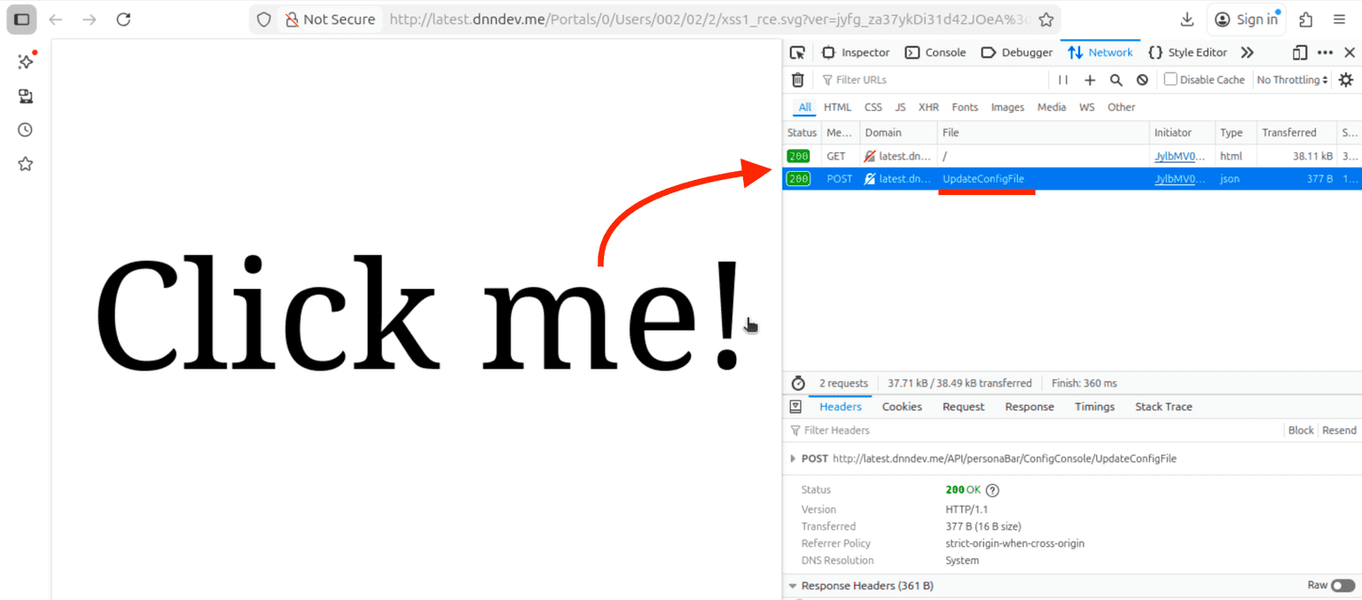 By inspecting the network traffic we can see the victim’s browser calls the “/API/personaBar/ConfigConsole/UpdateConfigFile” endpoint.