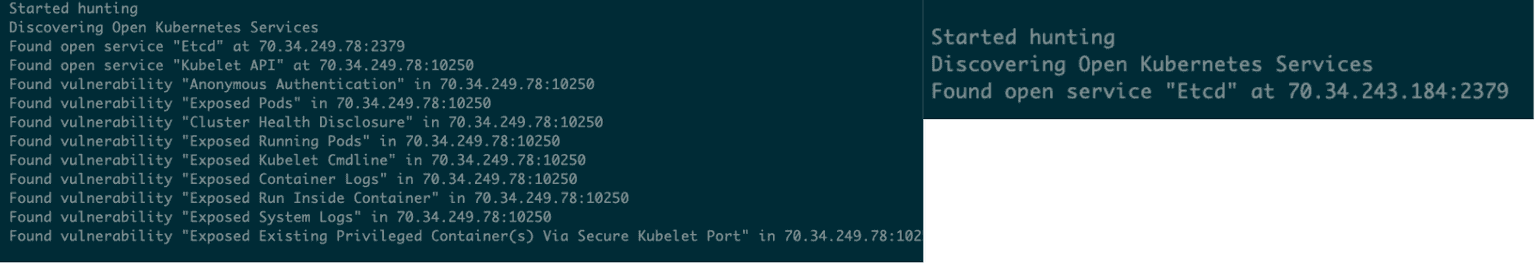 However, ten out of eleven findings disappeared from one scan to another when scanning the same two targets using Kube-Hunter, as we can see from the screenshot above. Furthermore, Kube-Hunter fails to find the service even in the setup that uses one of the most common ports for the Kubernetes API Server.