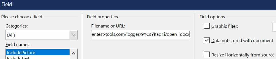 Create the requested fields as shown below (Field names -> IncludePicture; URL: https://pentest-tools.com/logger/9YCsYKao1i/open=docx and check “Data not stored with the document”), and click OK: